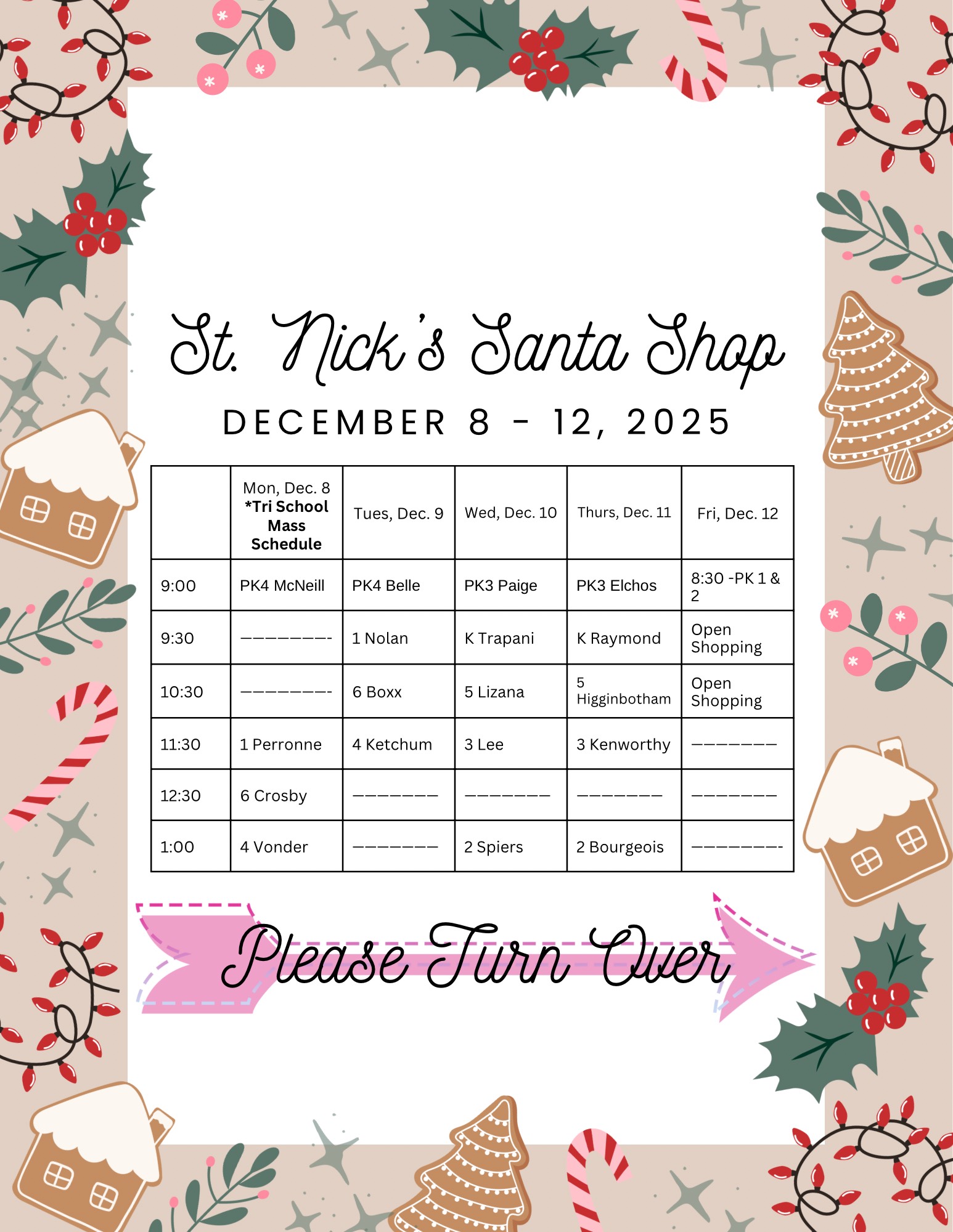 See the attached shopping schedule, and use the Santa Shop Form to help make shopping easier for your child.