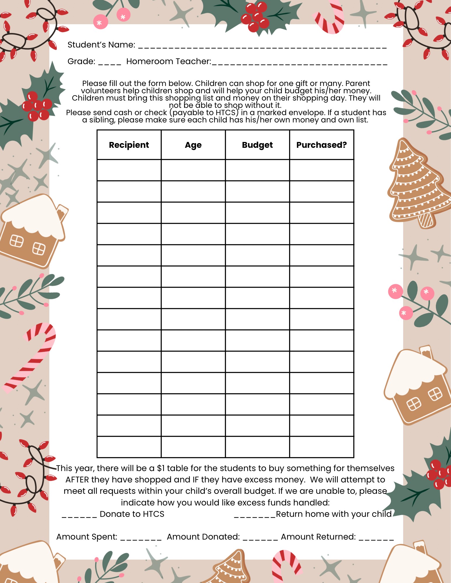 See the attached shopping schedule, and use the Santa Shop Form to help make shopping easier for your child.
